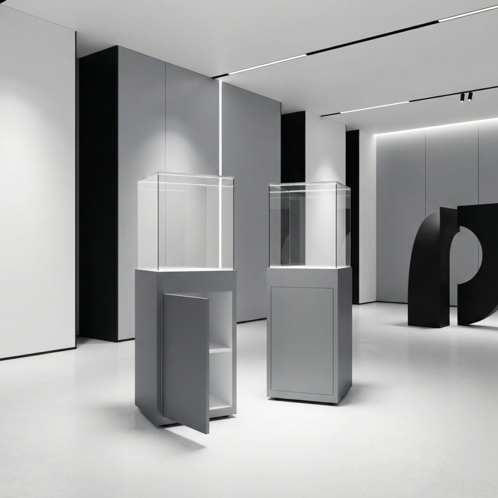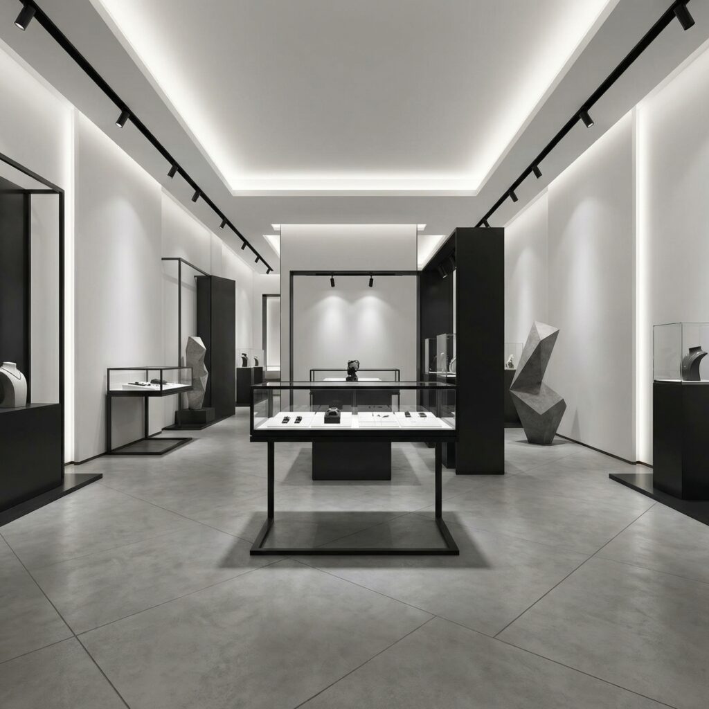 무엇을 파는지, 무엇이 중요한지 바로 이해됩니다. 제품이 더 고급스럽고 자신감 있어 보이며, 브랜드의 메시지가 조용하지만 분명하게 전달됩니다. 미니멀한 전시는 선택을 쉽게 만듭니다.